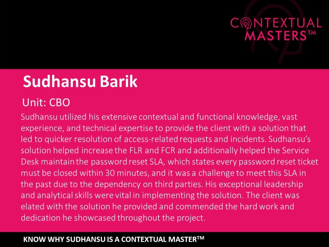 I recently dealt with Sudhansu Barik on IT Ticket number INC******** and I wanted to let you know what an amazing service he provided.